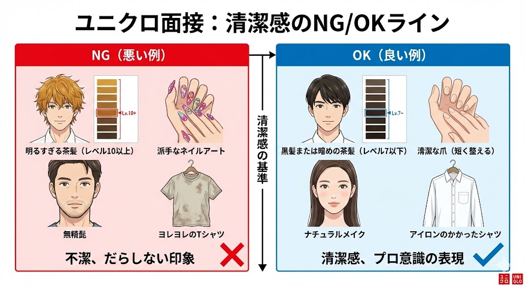 ユニクロは老若男女、あらゆる層のお客様が来店します。そのため、スタッフには「誰に対しても不快感を与えない、ニュートラルな清潔感」が求められます。個性を爆発させることよりも、ブランドのイメージを損なわない「プロ意識」が最優先されるのです。